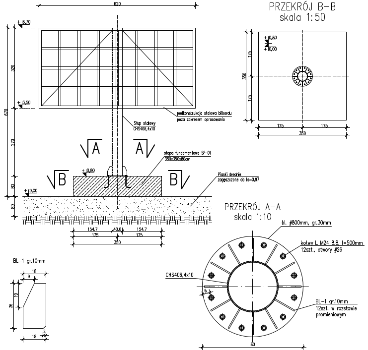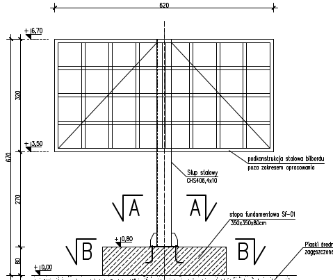 Projekt konstrukcji wolnostojącego bilbordu reklamowego na jednym słupie stalowym.