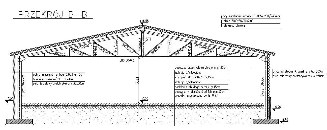 Hala produkcyjno-magazynowa w konstrukcji żelbetowo-stalowej. Słupy prefabrykowane żelbetowe posadowione na stopach fundamentowych. Dźwigary stalowe kratowe, płatwie „zetowe” cienkościenne. Pokrycie płytami warstowowymi.