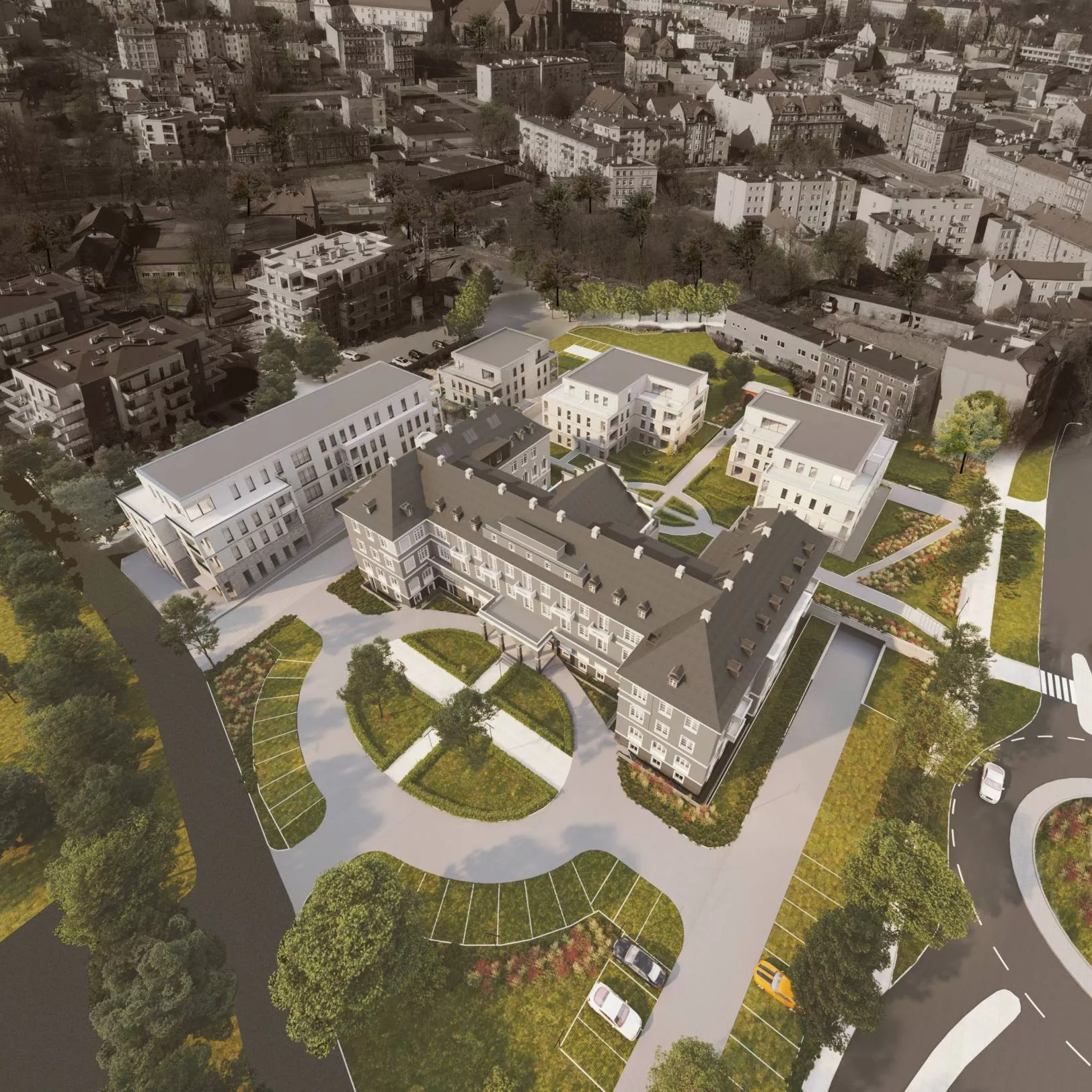 Inwestycja obejmuje przebudowę i rozbudowę zabytkowego budynku dawnego szpitala na funkcję obiektu mieszkalnego wielorodzinnego z usługami oraz budowę zespołu budynków mieszkalnych wielorodzinnych w Świdnicy.